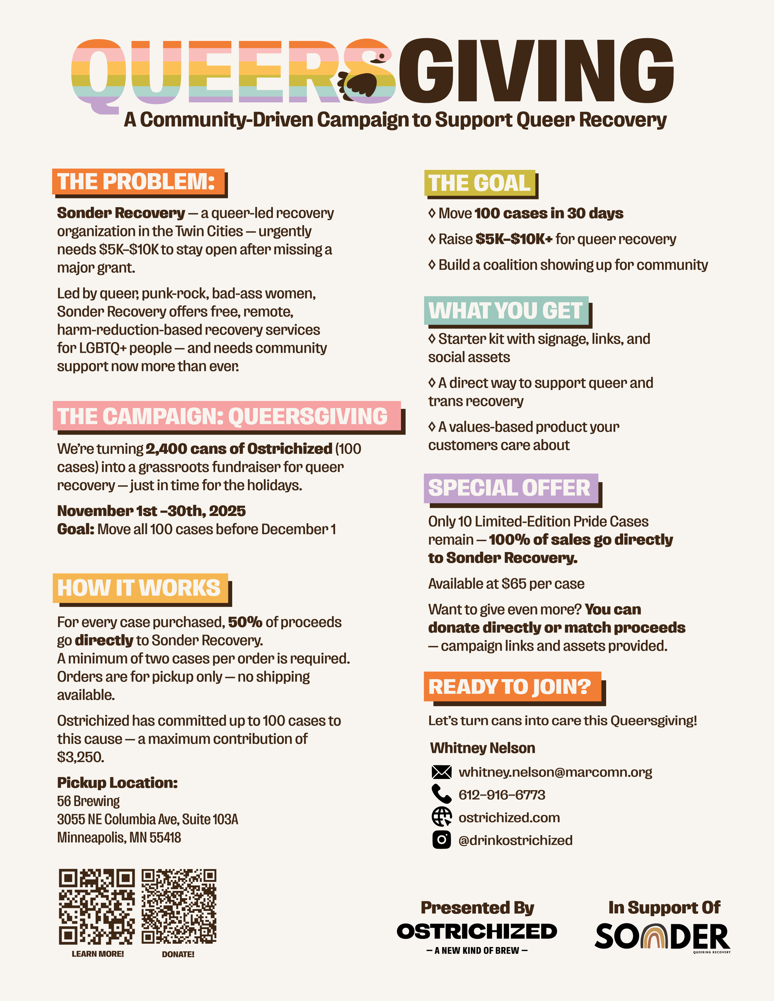 For every case purchased, 50% of proceeds go directly to Sonder Recovery. A minimum of two cases (24 cans/per case) per order is required. Orders are for pickup only — no shipping available.